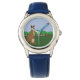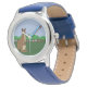 Conte o tempo com este divertido relógio de moda apresentando uma ilustração fofa e caprichosa de um canguru-mãe voando uma pipa em um campo verde de árvores para seu canguru bebê, que está feliz sentada na bolsa observando. Você pode até personalizar a banda e o estilo. Criado com papel de construção e manipulado em Photoshop pela KLeighE do Whimsical Cartoon Art ™ da Hinterland Harmony
