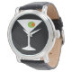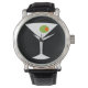 Este Classic Movie Martini Watch apresenta um fundo preto e a imagem de uma silhueta branca de um vidro martini. Dentro o copo é uma azeitona verde gloriosa com um colorau laranja. Este é um relógio de pulso divertido para todos que desejavam ser personagem de um filme clássico. Shaken não mexido, por favor!