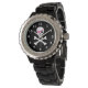 Um crânio e bósforos vestindo um relógio de correção ocular em forma de coração rosa-quente com números ; brincadeira alegre como um navio de bandeira pirata