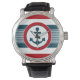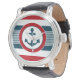 Design náutico com decoração em forma redonda com âncora sobre fundo listrado a azul, vermelho e branco