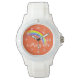 Crianças de arte em arco-íris coloridas veem com fundo laranja brilhante. Personalize com o seu nome lê atualmente Missy.