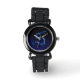 O design neste eWatchFactory Glitter Watch é um dragão azul-espião que se enrolam se difunde sobre chamas de azul em frente a um céu noturno com a constelação de Draco.