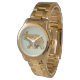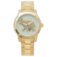 Um relógio de pulseira de ouro de tamanho excessivo da Unisex com uma imagem de um elefante índio ouro vintage com uma bola no seu tronco revirado, adornada com tornozelos e um boné e casaco de flores e o símbolo de Om, a sílaba sagrada cantada em orações e mantras hindus e budistas. Veja o encanto redondo correspondente e os brincos soltos. Veja a coleção inteira de Gemstones & Medallions Watch na seção ACESSORIES.