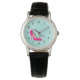 Um relógio personalizado com um calçado de estileta rosa quente. Colocado sobre um fundo de aquarela verde da menta. Chic e glamouroso.