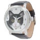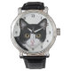 O gato preto e branco do rosto do gato adora relógio de pulso