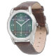 relógio de pulso da pulseira de couro na moda, com o clássico clã teal Henderson tartan, em padrão de xadrez, na face, com números brancos e pontos durante as horas. O texto personalizado branco lê Henderson, e pode ser personalizado para ler o que você quer.