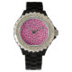 O relógio de esmalte preto da rocha feminino com uma imagem de um pica-leopardo rosa. Veja a fivela de fecho da cinta oval, charme redondo, brincos soltos, chaveiro de botão redondo, chaveiro de acrílico redondo de lado duplo e colar redondo. Veja toda a coleção Este e Aquele Relógio na seção ACESSÓRIOS.