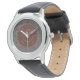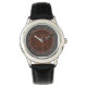 Esta mandala, tema Leão, retrata uma pedra de onyx cercada pelo símbolo do cartaz, a constelação, e o símbolo alquímico do Fogo entre o filigre de cobre avermelhado e as ondas gravadas. Este relógio está disponível em vários tamanhos, cores e estilos, incluindo tamanhos para crianças e adultos.