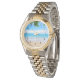Um relógio com fotografia de paisagem de uma praia tropical. Areia quente, água azul e azul com folhas tropicais ao longo do topo.