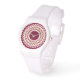 Padrões circulares brilhantes se circundam neste relógio único e colorido. As cores incluem o vermelho marrom, bronzeado e branco, com o centro vermelho farrado. Este padrão tem um estilo festivo sudoeste.