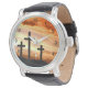 Sol, ou pôr do sol, em três cruzes na silhueta comemorando a ressurreição de Jesus Cristo na Páscoa