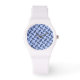 Um padrão repetitivo se espalha através de um fundo azul-céu neste relógio divertido.