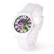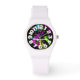 Saia na multidão com esta legal pintura neonatal esplaxando o arco-íris verde, rosa, amarelo e roxo colorido sobre fundo preto, relógio de pulso, personalizado com nome ou texto, em tons brilhantes e fluorescentes. Faça uma declaração de estilo divertida e nova com esta moda moderna dos anos 80.