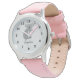 Nome personalizado: "As raparigas cor-de-rosa bonitinhas do coala". Relógios de pulso personalizáveis para crianças. Aniversário feminino ou ideia de presente de Natal para meninas. Design australiano de vetor animal selvagem. Faça seu próprio cronista para filha, neta, netos etc. Adicione o seu próprio nome personalizado ou letras monográficas de criança. Padrão de fundo da Bolinhas cinza. Modelo de tipografia de script. Banda de couro rosa.