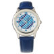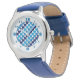 Corações diagonais em tons de sotaque azul este relógio de pulso divertido mostrado no estilo infantil, mas também divertido para adultos. Coordenar os números azuis em um fundo branco facilita dizer o tempo.
