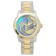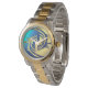 Assistentes de pulso de na moda com gráficos de uma vibração de tom dourado e design de dragão de yin-yang azul-aqua. Gráficos de pontes douradas marcam pontos de 12, 3, 6 e 9 horas. Personalize para adicionar qualquer texto que você quiser.