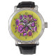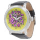 Um padrão retrô muito simples e moderno de formas circulares em tons de rosa, laranja, roxo e branco sobre um fundo amarelo neon. Criado no ArtRage 3 Studio Pro, com estêncils e camadas, por Gina Lee Manley ©gleem Você escolhe estilo de relógio e cor da pulseira de pulso.