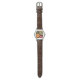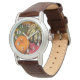 Um relógio clássico de couro castanho com imagem de uma abóbora laranja e verde e uma abóbora amarela em folhas vermelhas, douradas e verdes. Face opcional do relógio prateado. Consulte o charme redondo correspondente e o chaveiro de acrílico de lado duplo retangular. Veja toda a coleção de Ação de Graças na categoria ACESSÓRIOS na seção HOLIDAYS.