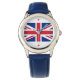 Que relógio fantástico para vestir quando você está fora e sobre isso. O relógio tem o Jack Union na frente e uma correia azul. O relógio pode ser personalizado: estilos (homens, mulheres, crianças), cores, precintas, texto, etc. Este é um presente excelente para um amante do Reino Unido!