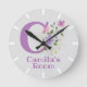 Crianças, Relógio De Quarto. Design apresenta Monograma & Nome com Flores em ambos os lados no estilo pastel de cor de água. O nome de exemplo é Camila. Altere o nome conforme desejado para qualquer pessoa com um nome que comece com C.