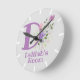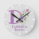Crianças, Relógio De Quarto. Design apresenta Monograma & Nome com Flores em ambos os lados no estilo pastel de cor de água. O nome de exemplo é Delilah. Altere o nome conforme desejado para qualquer pessoa com um nome que comece com D.
