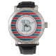 Design de temas náuticos com decoração em forma de monograma, em forma redonda, com estrelas sobre fundo listrado a azul, vermelho e branco