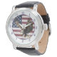A majestic bald eagle has outstretched wings and bared claws on this patriotic watch. The eagle image is set against a portion of a distressed USA flag. Navy blue numbers around the white perimeter border make the watch easy to read.