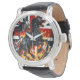 Este relógio exclusivo apresenta um design inspirado em um cavaleiro esqueleto montado em um cavalo mecânico, ambos envoltos em chamas. O mostrador do relógio exibe a imagem detalhada do cavaleiro segurando uma lança, vestido com uma capa preta esvoaçante, e o cavalo com olhos brilhantes e vermelhos, decorado com a bandeira britânica. O fundo do mostrador é adornado com uma grande bandeira do Reino Unido, enquanto os ponteiros do relógio se movem sobre destroços e armas em chamas. Este relógio é uma peça intensa e dramática, perfeita para quem deseja um acessório que evoca poder e destruição.