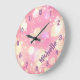 Este relógio apresenta uma imagem de glamour rosa e roxa com estrelas e rajadas de formas e cores fantásticas. Há um nome totalmente personalizável na frente!