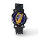 Relógio de souveneir da Irlanda, com um motivo harp irlandês dourado, contra um fundo azul escuro.