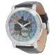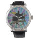 Drummer Musical e Blue Green Fractal Star Watch. Um baterista toca um tambor sobre um padrão legal de explosão fractal azul e verde com números de ouro metálico claro. Um Music Watch para seu percussionista, músico ou amante de música favorito.
