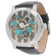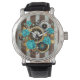 Relógio antigo e patenteado, adornado com joias, mãos de ouro e algarismos latinos com rosa de turquesa sobre fundo castanho e listrado. Estilo Steampunk.