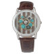 Relógio antigo e patenteado, adornado com joias, mãos de ouro e algarismos latinos com rosa de turquesa sobre fundo castanho e listrado. Estilo Steampunk.