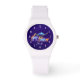 Um relógio com suas iniciais personalizadas de monograma com uma imagem de aquarela digital de um rebanho de animais selvagens correndo juntos. Os animais incluem golfinhos saltadores, girafa, elefante, canguru, rinoceronte e gato selvagem. O fundo é um design abstrato roxo escuro.