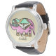 Este é um relógio de tema de elefante muito fácil de personalizar, pois este modelo só precisa adicionar o nome. Este é um presente excelente personalizado para aniversários, graduação, Natal, feriados, como presente de apreciação, e para qualquer ocasião especial em geral. Elementos sobre a composição da design, elefante, cores verdes, cor-de-rosa, azul, lacre e tons castanhos, e tipografia de letras.