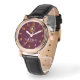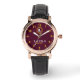 Radiate sophistication with this burgundy and gold personalized watch, the perfect blend of luxury and timeless style. Featuring a deep burgundy dial with gold hour markers and a refined monogram crest, this elegant accessory adds a royal charm to every outfit. The white leather strap and rose gold bezel create a striking contrast, making it ideal for both everyday wear and special occasions.