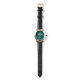 personalized watch, luxury gift, emerald green dial, custom initials, elegant wristwatch, white leather strap, gold watch, anniversary gift, timeless fashion, classy accessory