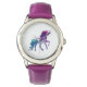 Relógio de criança bonito com uma silhueta de um unicórnio em uma brilhante lavagem de cor d'água roxa, azul e rosa. Perfeito para a menina. ********************************************************************************* Se estiver interessado em combinar itens ou em um design personalizado, entre em contato.