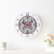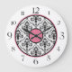 Relógio de parede redonda elegante com uma cor damasco preta e branca acentuada com rosa. Os números estão em um padrão variando no tamanho do rico para quebrar a uniformidade que a maioria dos relógios exibe.