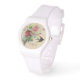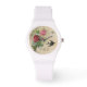 Monogrammed observa as mulheres, pela red_dress, apresentando uma colagem de giro e vintage de um buquê elegante de rosas vermelhas e rosa vitorianas, uma ave andorinha e libélula voadora, com um modelo de texto para as suas iniciais de três letras monográficas (letra de script, em castanho). O buquê das flores é impresso sobre fundo manuscrito, formando um padrão texturizado e sutil, em tons de creme. Personalize facilmente os relógios de estilo vintage para as mulheres, com as suas iniciais de monograma. Vintage alterou a arte (elegante design floral) digitalmente criada por red_dress, usando imagens antigas, a partir dos anos 1800, de rosas antiquados.