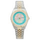 Este elegante relógio de pulso para suas feições falso brilho, conchas coloridas em múltiplas cores de cheiro, coral rosa, aqua e ouro. As conchas são colocadas em listras de chevron azul-aqua que também contêm imagens do padrão-concha, e as contrastadas com listras de chevron brancas. Os lojistas brancos em uma banda de talhe correspondente facilitam a leitura do relógio. Uma estrutura em círculo dourada separa o padrão da banda azul teal. Bonito!