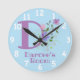 Design apresenta Monograma & Nome com Flores em ambos os lados no estilo pastel de cor de água. O nome do exemplo é Darcee. Relógio de quarto infantil, relógio de quarto infantil. Altere o nome conforme desejado para qualquer pessoa com um nome que comece com D.