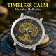 A imagem mostra uma estátua buda dourada espantosa, que mostra características serenas e designs intrincados. A figura está sentada em uma pose meditativa, cercada por detalhes de motivos florais que simbolizam paz e iluminismo, criando uma atmosfera calmante.