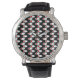 Este relógio masculino tem uma design moderna do século médio de ovais brancos com círculos vermelhos ligados por linhas brancas num campo de preto. Quer cores diferentes? Me mande mensagem.