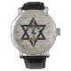 Estrela Negra de David com cruz castanha e números romanos dourados. Nome de modelo criado para você. Fundo de tijolos brancos.