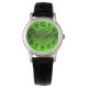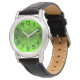 Este relógio feminino tem um design geométrico de cinco tons de verde correndo horizontalmente.