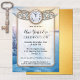 Um convite de festas mágico de Ano Novo com um relógio de vintage com asas elegantes no fundo da paisagem de inverno. O verso mostra um design de papel dourado.