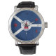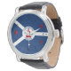 Watch with flag of city of Fort Wayne, Indiana; blue and white flag and with red blockhouse in the center and three illustrations in the blue field - illustration of Native American’s head, French fleur-de-lys and British lion