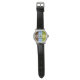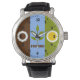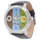 Watch with flag of Fresno, California; flag with three vertical bands of brown, blue and green, with stylized illustrations of cog, plant and sun