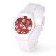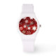 Um relógio bonito para os feriados em branco com um rosto alegre em flocos de neve em vermelho.